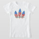 En amerikansk flagga och tre surfingbrädor gör tillsammans denna patriotiska grafik som säger "Surfa Amerika". Det finns en komplementtryckt text på baksidan av t-shirt.