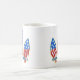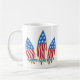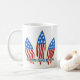 En amerikansk flagga och tre surfingbrädor gör tillsammans denna patriotiska grafik som säger "Surfa Amerika". Anpassa den här designen till mugg som du vill ha.
