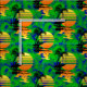 Hawaianskt mönster av en surfaresilhouette framme av en tropisk solnedgång.