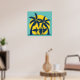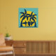 Cute-grafik på strandscen med handflatan träd, surfare och sol. Perfekt för en surfa älskare.
