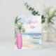 En inbjudan till en födelsedagsfest till stranden för en tjej. En vattenfärgad sandstrand, oceanen vågar och handflatan träd som bakgrund och en rosa surfboard på stranden. 1 lakan = 1 inbjudan tryckt kant till kant.