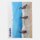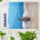 En digital konvertering av tre kanadensiska gäss överväger att gå ut i den inkommande surfan på Sjö Pend Oreilles strand i Sandpoint, ID. Blåberg finns i avstånd. Text som läser "IDAHO" visas också.