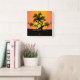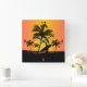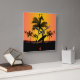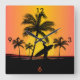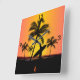 Surfare som går på strand med surfingbrädan på förgångna tropiska palmträd för solnedgång med att glittra hav i bakgrunden