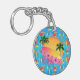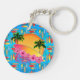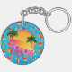 Surfareflickan med surfa stiger ombord, palmträd, solnedgången och hibiskusblommor.