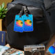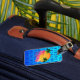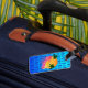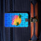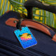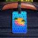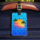 Surfareflickan med surfa stiger ombord, palmträd, solnedgången och hibiskusblommor. Med en havblåttbakgrund och hawaianska en Honu havssköldpaddor och Tiki maskerar.