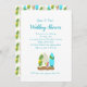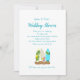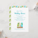 Dusch för paret, surfingbrädinbjudan. Möhippa eller förlovningsfest med ett surfningstema. Avslappnad design med enkla ordalydelser och mallar som är lätta att använda för. Tropiska surfingbrädor är sitta i sand på vita kort med mörk grönt text.