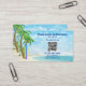 Detta QR-affärskort har en surfboard på en tropisk strand med handflatan träd. Vatten är ett vackert blått och det finns moln som är spridda i himlar. - av Beach Bum Bum
