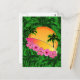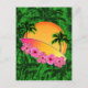 Surfande grafik med ytskikt, handflatan träd, rosa hibiscus blommor och solnedgång.