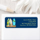 Surfbrädor returadressetiketter med anpassade textmallar. Gul text är tryckt över mörkblått. Tre dekorerade surfbrädor fastnar i sanden vid kanten av dessa anpassade etiketter.