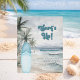En inbjudan till en retro strand födelsedagsfest. En akvarellmålad sandstrand, havsvågor och palmer som bakgrund, och en blå surfbräda på stranden.
