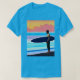 Tee i en surfare på stranden, silhuetterad mot en halvabstrakt bakgrund av vatten och en solnedgång himlar