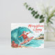 This bright watercolor Christmas postcard features Santa Claus surfing a giant turquoise Hawaiian wave beneath a warm tropical sky.