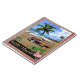 Vackra retro-stil bild, som visar en äldre bil med ytskikt på stranden, omgiven av tropisk vegetation. Text "Surfin' Hawaii".