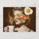 En kvinna har kaffe mugg och en frukost av avokado och tomattoast och ett stekt ägg flyter i luft surreal konst