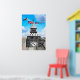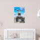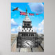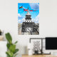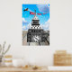 Poster/utskrifter: Surreal teckning som illustrerar berömd Londons landmärke - Big Ben klocka torn under det ljusa, soliga "strandliknande helgdag"-landskapet med flygplan som drar unionens Jackar (brittisk Flagga) över himlar.