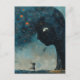 En flicka tittar förvånat på blå träd med en ansikte-surrealistisk fantasi.