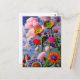Surreala, vismliknande vykort för digital konst har färgstarka, klistrade blommor mot blå himmel med rosa moln. Perfekt för älskare av kronor och fiberkonst.