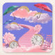 Det här är en vismisk digital illustration med ett lysande blå himmel med flytande rosa och vita fluffa moln. En böjd rosa trappa med rosa steg stiger från grund i bilden, vilket leder fram till molnen. Två stora analoga klockor med svarta romerska siffror placeras vid basen av trappor, en på vardera sidan. En rockstol av rosa trä sitter på högerna av trappor. Det finns två prydnadsblommor i rosan i bilden, en peony till lämnad och en på högerna. Tre flytande paraplyer är suspenderade i molnen - ett blått paraply till lämnad, ett tealparaply i mitten och ett rött paraply på högerna. Varje paraply har ett svart handtag och placeras ovanför en gyllene halvklotform måne. Den övergripande paletten färg består av rosa, blått, vitt, guld och teal och skapar en drömmande, sagolik atmosfär. Molnen har en mjuk, bomullskandiserad struktur och hela bilden har en vismisk, storybockskvalitet. Underlägg är en fyrkantig papper massa som underlägg. Underlägg-uppsättningen innehåller sex underlägg.