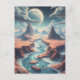 Ett vackert landskap med stort fullt måne stigning över en söt blå flod. Ai-konst skildrar ett vackert annat världslandskap med en drömliknande kvalitet. Behålla i kontakt med detta vackra, eaterala, fantastiska världsvykort.