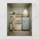 En retroinspirerad köksscen tar en oväntad vändning med ett jättelikt prickigt ägg som vilar på toppen av ett pastellfärgat kylskåp. En kvinna i en vintageklänning står i tyst kontemplation, omgiven av känslig blomsterinspirerad tapet och snyggt arrangerade köksartiklar. Kompositionen blandar nostalgisk hemmastukänsla med surrealistisk fantasi och skapar en nyfiken och lätt lekfull atmosfär fylld med intriger och visuell berättande.