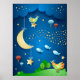 Fantasslandskap nattetid med hängande måne, stjärnvåg, fåglar, ballonger och flygande fiskar. Surreal konst
