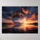 A reflective sphere mirrors the vast cosmos against a dramatic sunset. The scene blends celestial and terrestrial elements in harmony.