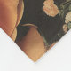 The image presents a surreal scene where a person sits with their back to the viewer, observing a landscape featuring elephants and a zebra standing in water. The scene is framed by an abundance of peach and yellow flowers and lush greenery, creating a dreamlike atmosphere. The background includes trees and a flock of birds in a light blue sky.