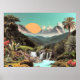 Denna surrealistiska landskapsmålning transporterar betraktaren till en frodig tropisk dal där naturen känns förstärkt, fridfull och nästan mytisk. Tät grönska och exotiska växter inramar en serie forsande vattenfall som störtar ner i lysande turkosa bassänger och skapar en känsla av friskhet och lugn rörelse. Bortom dalen reser sig lager av berg i en mjuk dis, medan en varm, överdimensionerad sol hänger lågt på himlen och badar hela scenen i gyllene ljus.