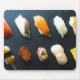 Elevate your workspace with this modern sushi-themed mouse pad, featuring a perfectly aligned array of nigiri and gunkan sushi on a sleek black slate surface. With ten unique pieces — from tamago and scallop to ikura, eel, and salmon — the composition is as stylish as it is delicious.
