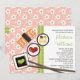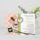Ska du kasta en japansk temed-möhippa? Branden och hennes gäster är säkra på att de här söta och söt sushi-inbjudningskort för möhippa med en rosa och vit körsbärs- blommar och grönt kimonos inspirerade bakgrund och ett par korsade käppar, tallrikar av sojasås och hjärtformade vasabi, och tre biet sushi (hjärtformade tonfiskrullar, laxnigiri och en veggilill). Bild © Krissy H. Studios, LLC.Alla rättigheter förbehållna.