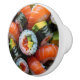 A kitchen cabinet knob with a realistic picture of a plate of avocado sushi.