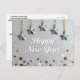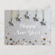 Ring in the New Year with glamorous sparkle! This dazzling design features a rich background of vibrant silver glitter. Elegant white script reads "Happy New Year" beneath five beautiful silver star ornaments hanging from shimmering gold cords.