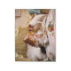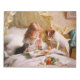 Vintage illustration of a lovely young girl praying before having breakfast in bed while a cute little kitten and a small dog are watching, eager to catch a piece of food. Oil on canvas by Charles Burton Barber.