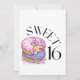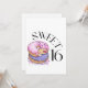 Denna inbjudan visar orden "Sweet 16" i ett unikt tryckt teckensnitt i svarta bokstäver med munkar med fyllning och strössel i detta söta 16-årsdagstema och stil. Tryckt på ett klassiskt, runt papper med 17,5 pts tjocklek med en obestruken mat finish med en äggskalstruktur tillverkad och tryckt i USA med "Det är en fest" tryckt på baksidan.
