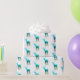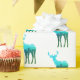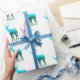 Den här presentförpackningens papper visas i vitt med en blå till grönt-/hjort med sina tändare. repetitiv text. Anpassa det här objektet eller köp som det visas. Bilden från lagrar på www.freepik.com