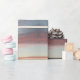Ljus bild av rosa och grått moln vid solnedgång. Blekens gult och blå himmel är gängade med molnen. Bilden är uppdelad med spegel mönster och bildar kaleidoskopisk effekt. Detta skapar en lugnande, säker effekt.