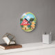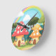 Cute svampgårdar med röda, bruna och blå hattar med vita fläckar. En blå himmel med regnbåge. Snyggt på väggen i ett barnsovrum.