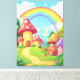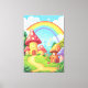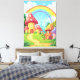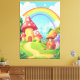 Cute svampgårdar med röda, bruna och blå hattar med vita fläckar. En blå himmel med regnbåge. Snyggt på väggen i ett barnsovrum.