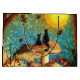 Söt bild av två katter som sitter på en jättesvamp i en skog full av svampar som tittar på höstlöven som faller mot solen och den blå himlen för att skapa en underbar saga landskapsbild.