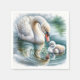 Ett graciöst svan lutar sig nedåt mot sin fluffy cygnet i stilla vatten.