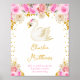 Den här söta och fantasifulla affischen har en elegant svan och rosa rosor blommarrangemang med falskt guld glitterkonfetti. Texten kombinerar handskriven stil och sans serif-teckensnitt för en stilren och modern look. Den kan anpassas med ditt barns födelseinformation, såsom namn, storlek, datum och tidpunkt för födseln, eller om du vill ge den som en present till en baby shower kan du redigera och ta bort texten.