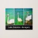 Svanar på Balaton i Sjö - tre olika svanar tittar åt tre olika håll. Bakom dem finns ett grönt blått vatten som bildpussel.