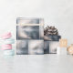 Ett svan glider på ett skonsamt sätt på en serene sjö omgiven av dimma, med elegant träd och avlägsna fåglar som förbättrar den lugn atmosfären