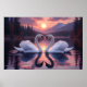Två vita svanar bildar ett perfekt hjärta under den mjuka glöden av måne, som reflekteras i lugn vatten i skymningen. Scenen förmedlar romantik, renhet och harmoni, med berg och skogar som skapar en magisk och oförglömlig atmosfär.