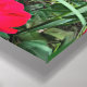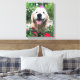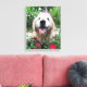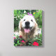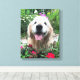 Lägg till lite gyllene lycka i ditt hem! Det här kanvastrycket innehåller ett foto av en söt, leende hund för guldutvinning som ligger utanför bland blommor med röd vild.