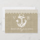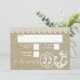 Rustik falskt burlap och vit rustik ankare och sicksack- eller chevronstildesign för svarsbrev för att komplettera inbjudan. Ankar-design med rep och utseendet av burlap på denna unika strandbröllopsinbjudan.