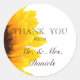 Modern Brown Gult Solros Tack Wedding Favor Sticker med formatet Mr. och Mrs. Fantastiskt solrosfoto på vit bakgrund med ditt bröllop-datum och namn. Perfekt för ett fallbröllop eller ett landsbyggsbröllop.