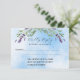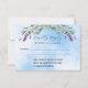En vit och blå sommar himlar som bakgrund, svart text. Dekoreras med lavender- blommigtar och eukalyptus greenery. Anpassa och lägg till ett svar efter datum. Tillbaka: lägg till webbadressen för bröllop i QR-koden för mer information och/eller OSA