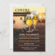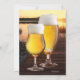 Inbjudan till möhippa med solnedgång vid en sjö med två ölglas på en brygga. På baksidan kan du välja om du vill ha en mörk trämiljö eller en större bild på glasen. Vacker för en utomhusfest, pubcrawl eller en grillfest.