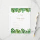 R.S.V.P-kort med vattenfärgade tropiska svävningsplantor löv som presenteras på en ren vit bakgrund med delikat guld-tecken.